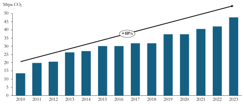 Companies are already capturing CO2 emissions and generating revenue through tax credits and CO2 off-take agreements. However, the sector is still working to create new commercial uses for CO2 to decrease the reliance on tax credits, which may face increased political pressure in the future. Even in the face of this challenge, the business case is strengthening. Importantly, every part of the point-source CCUS supply chain is commercially available today, with new projects under way and heading to market. Global CO2 capture capacity grew 10% year-on-year from 2010 through 2023, increasing from less than 15 million tons per annum (Mtpa) in 2010 to over 45 Mtpa by 2023 – as shown in Figure 1 below.