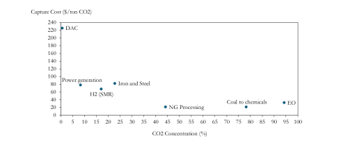 The cost of capturing CO2 is directly linked to its concentration. Point source CO2 capture, which is linked to processes with higher CO2 concentrations, typically has lower capture costs. For DAC, on the other hand, capturing CO2 is typically more expensive given the lower concentration of CO2 in the atmosphere. This is shown in Figure 2 below.